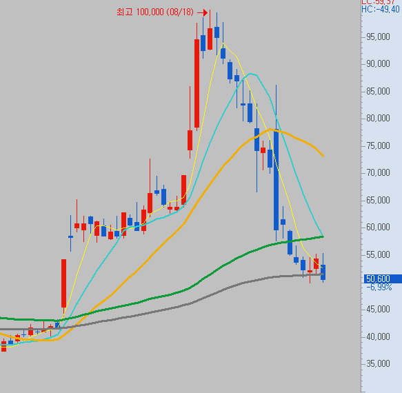 조금씩 매수를 담다가 5만원 지지를 생각하고